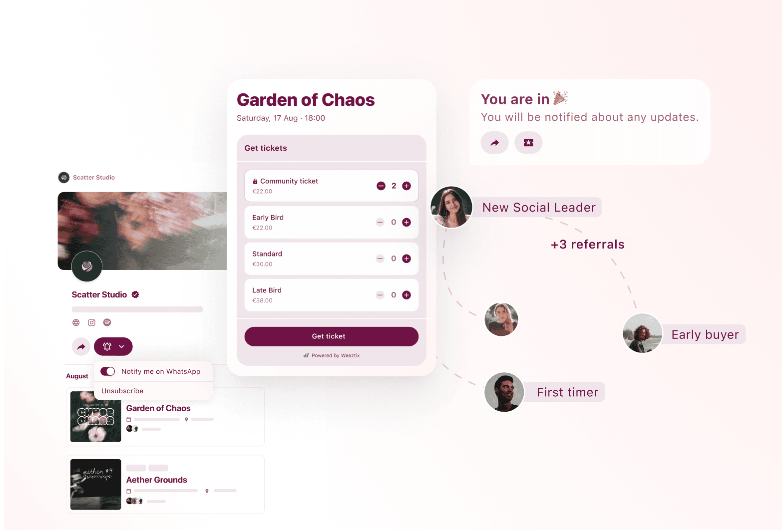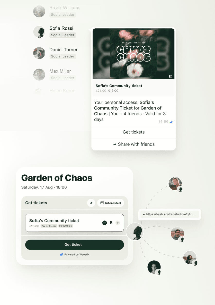 A larger share of sales comes from people you already reach. You get clear tracking of which invite worked and who brought friends. That means more predictable ticket sales and control of your crowd.