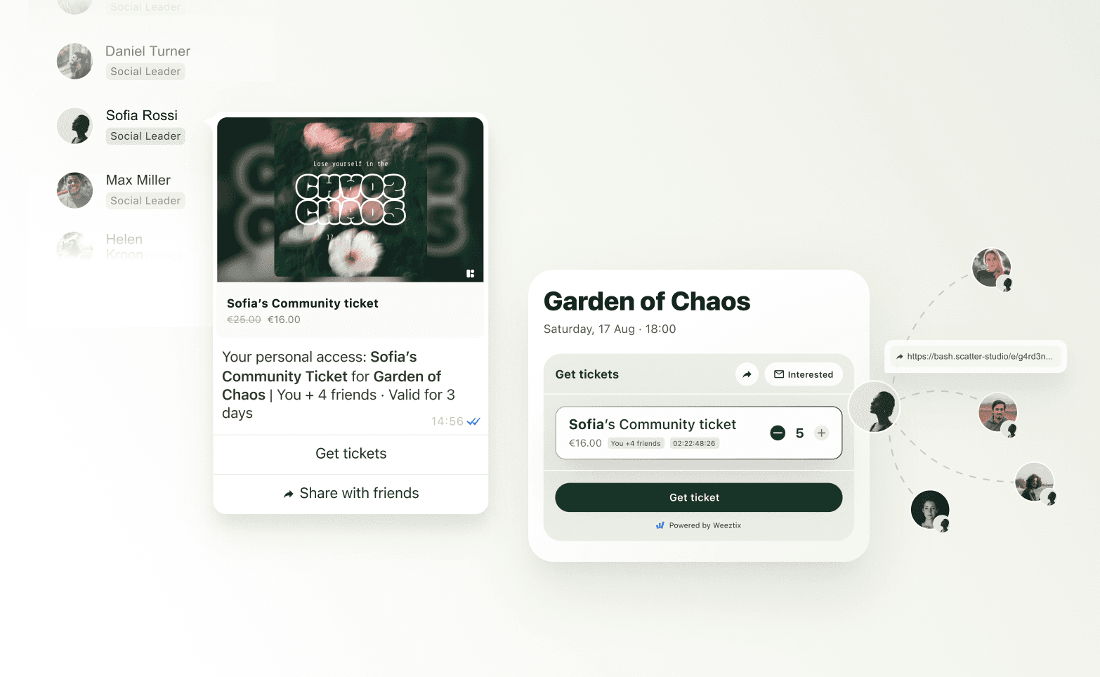 Find who carries your event: Regulars, group buyers, social leaders, early buyers, and more. Or use a hidden link.